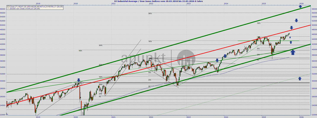 Der Dow Jones hat in den letzten 10 Handelstagen unterm Strich nicht viel Boden gewonnen. Der fällige Angriff auf die 47.000 wurde am letzten Dienstag abgeblasen. Der Kurs drehte vom Intraday-Hoch 46.714 nach unten ab.