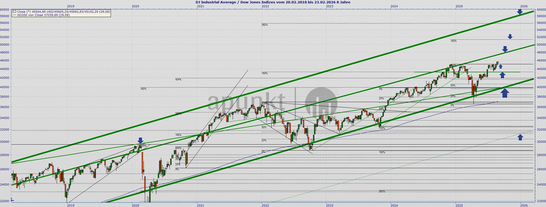 Positiv zu vermerken ist, dass der Dow Jones innerhalb seines kurzfristigen Aufwärtstrendkanals verblieben ist. Es gab also zu keinem Zeitpunkt ein Abrutschen unter 45.000.